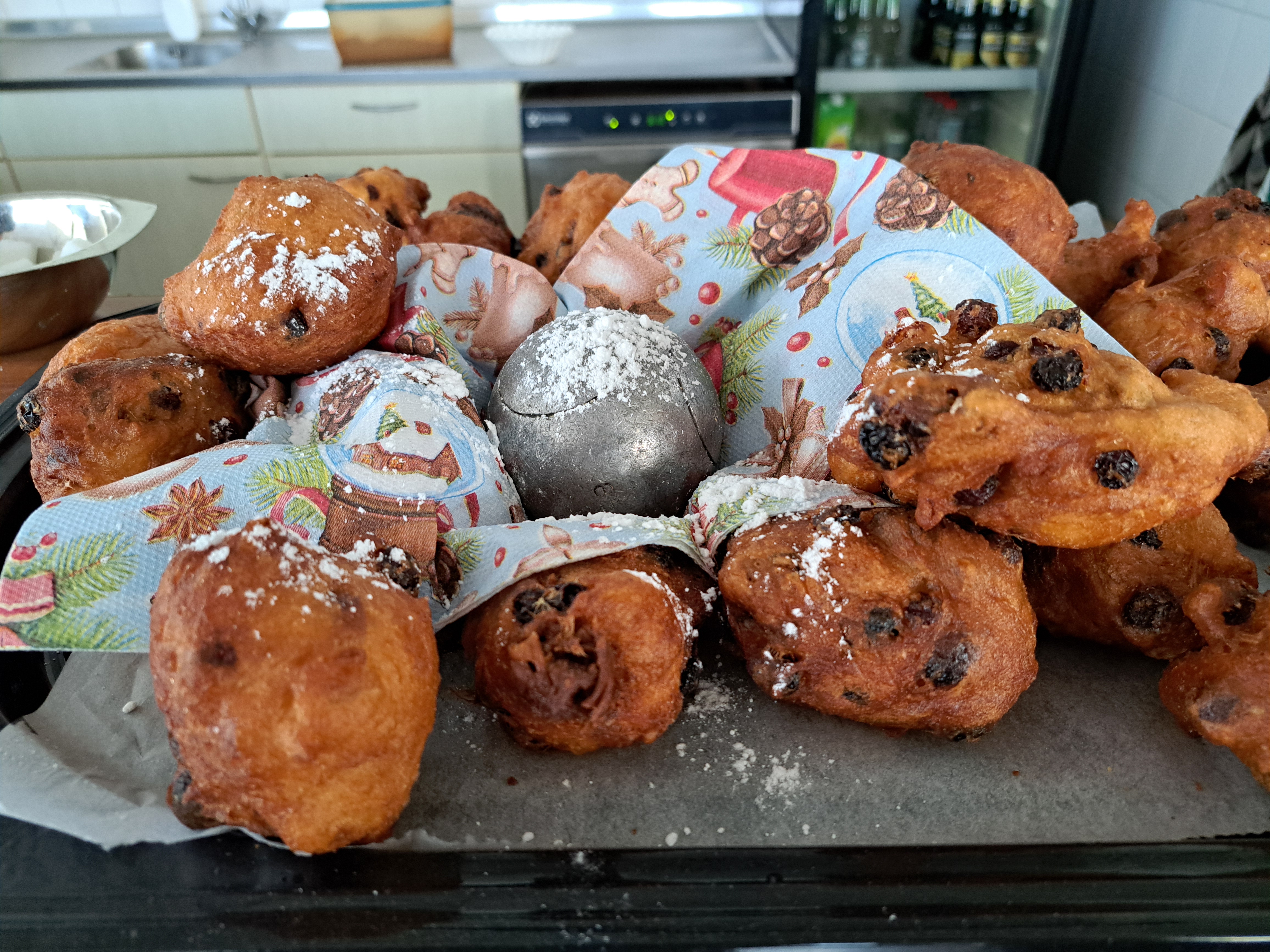 Dat moet een prachtig gezicht zijn, die twee in het schuurtje achter hun huis! En wij zijn er allemaal heel blij mee, want als we dan ‘s middags in ons clubhuis komen staan daar de schalen met oliebollen (en natuurlijk poedersuiker) meer dan uitnodigend uitgestald op de bar.