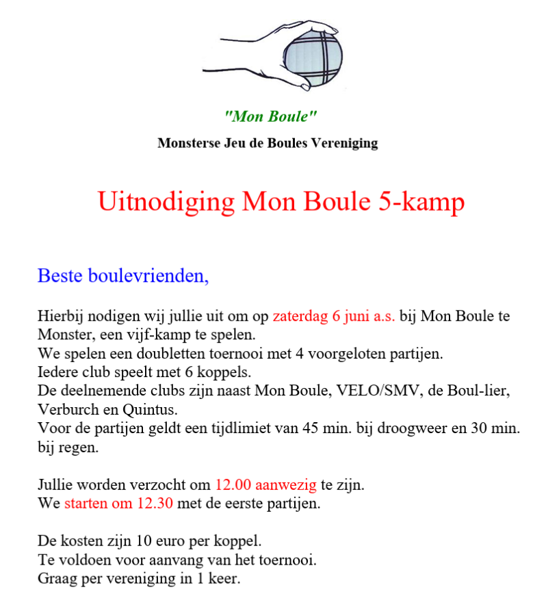 Onze vrienden van Mon Boule nodigen ons uit om mee te spelen met een Vijfkamp op 6 juni a.s. - lees hier de uitnodiging. Wij kunnen met zes koppels meespelen: als je mee wilt spelen schrijf je in via het formulier op het prikbord.